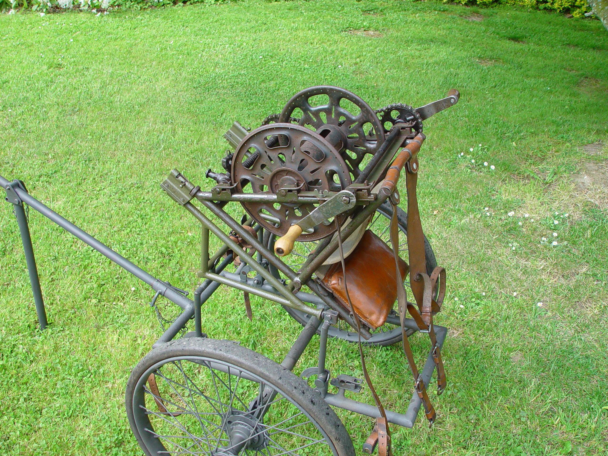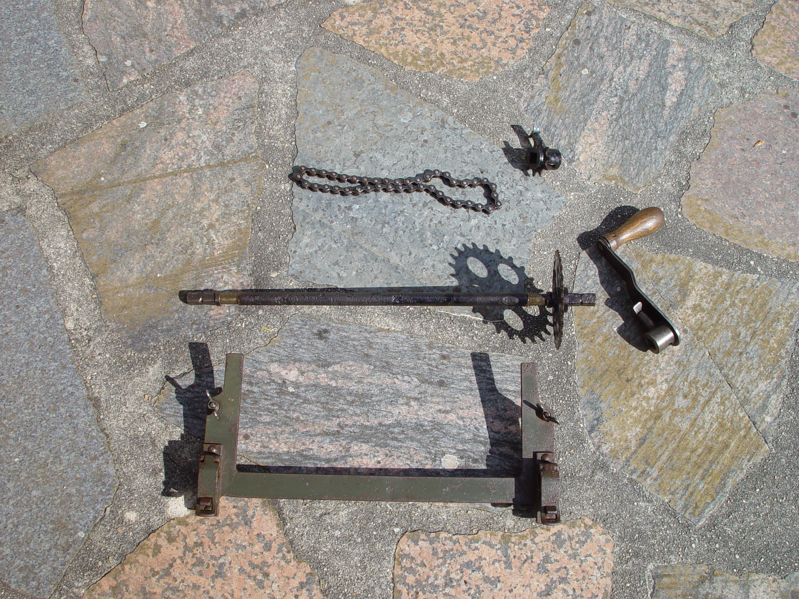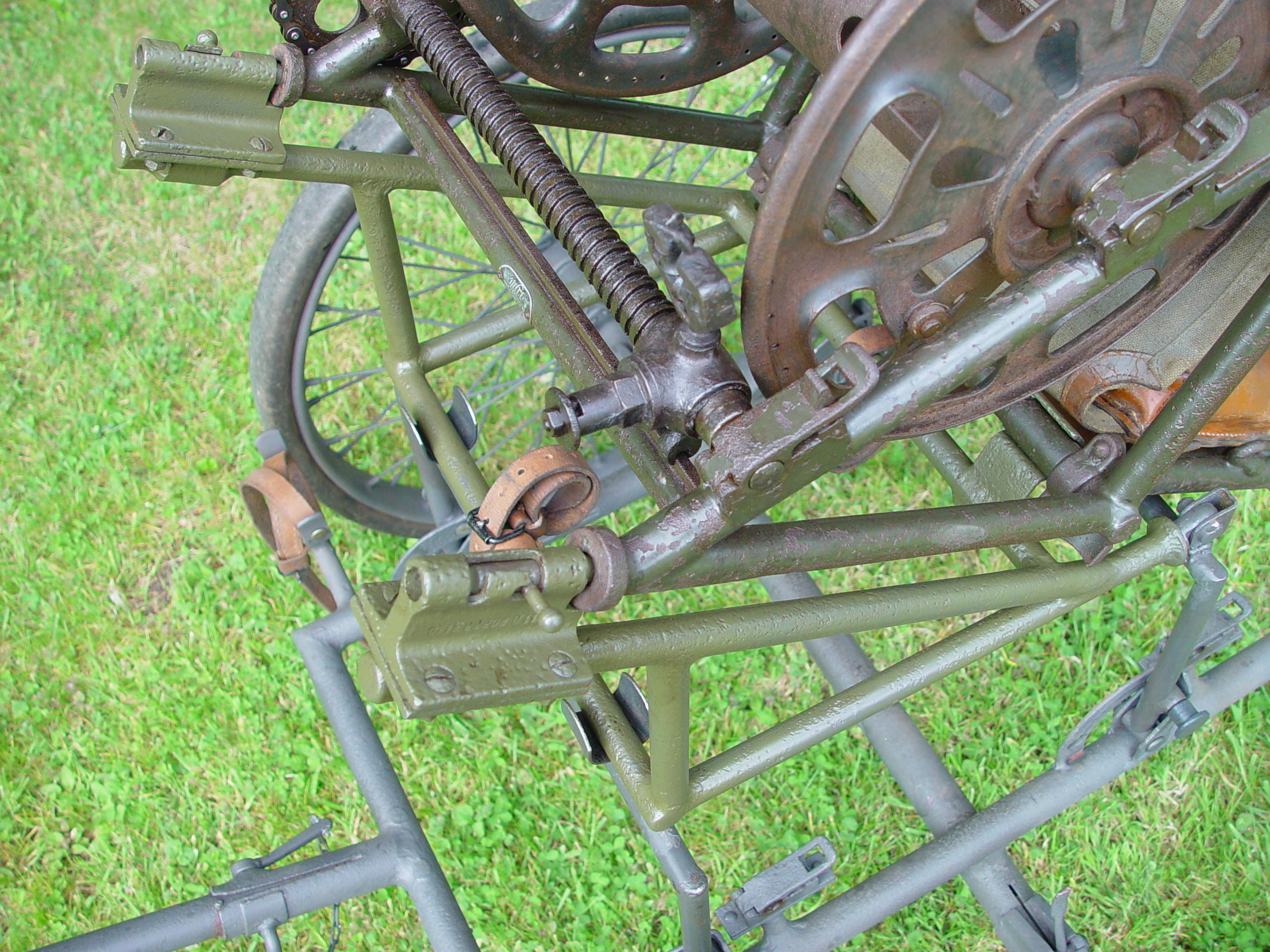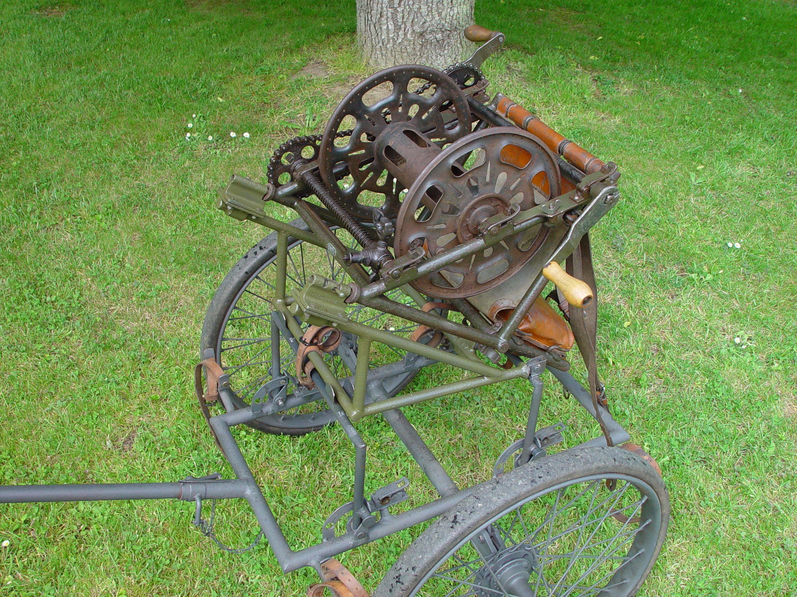 Funksammler 182 Posted May 18, 2019 Author Report Share Posted May 18, 2019 I found another bonkers accessory for the Nachrichtengerätekarren! If you mount the Rückentrage on your Nachrichtengerätekarren, the wire spools off towards the rear of the cart which is quite logical. If you want to use the cart to spool up the wire though, you have a problem as you would have to push the cart backwards to do this efficiently. No worries, the German engineers set to work and rather than simply fit another towbar attachment to the back of the cart the Germans chose to design a complicated reversal subframe. The subframe neatly slots into the attachments on the Nachrichtengerätekarren while the Rückentrage in turn is locked onto the reversal frame. Now these leather straps on the supports of the cable cart suddenly make sense, as they are used to keep the subframe secured to the cart. With the subframe fitted the cable feeds onto the Rückentrage from the front. The Rückentrage is slightly tilted backwards which makes changing the wire spools slightly easier and puts the spooling guide in the ideal position. The Rückentrage is also fitted with an additional driving gear with a handle on each side which can now easily be operated from the rear of the cart. So all in all, the subframe neatly solves a number of ergonomic issues... Although I have not found a manual describing the reversal frame, I suspect the frame and additional drive came together as a "spooling up" set. I also have not found the official name of the set and subframe, but without a doubt this was a wartime innovation. Interestingly, the backward tilt of the reversal frame was incorporated in the postwar design of the Nachrichtengerätekarren, although in the postwar design, the Rückentrage points permanently to the rear, so the card has to be pushed backwards during spooling up operations. regards, Funksammler 1 1 Quote Link to post Share on other sites